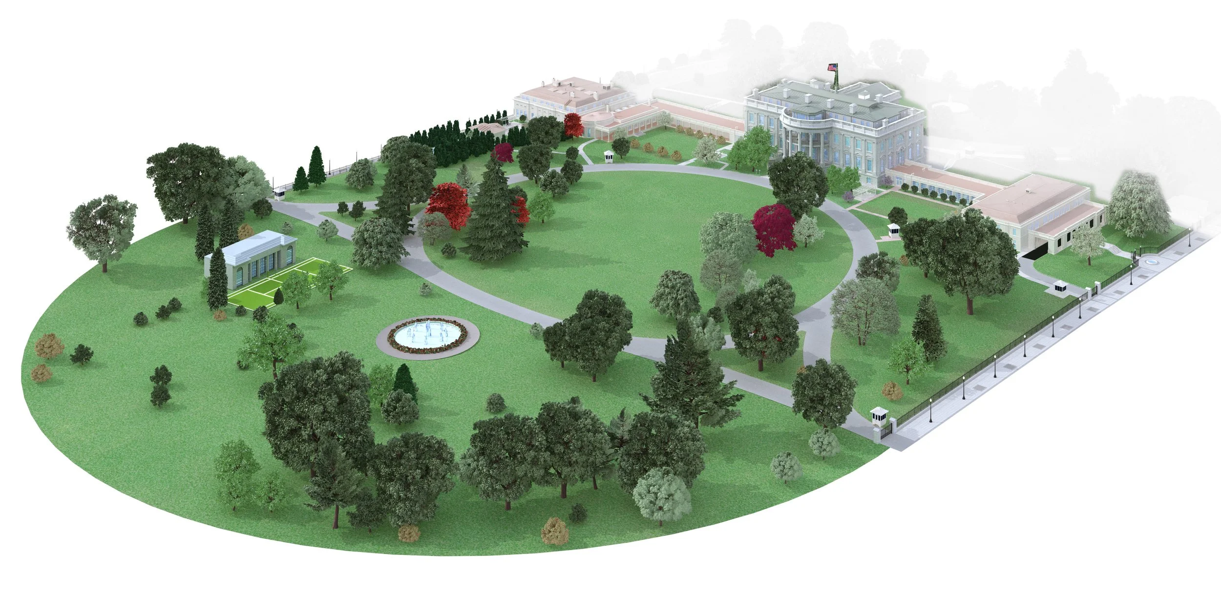 Pentagram chose the views they liked best, and I began populating the grounds with the trees in their actual locations: