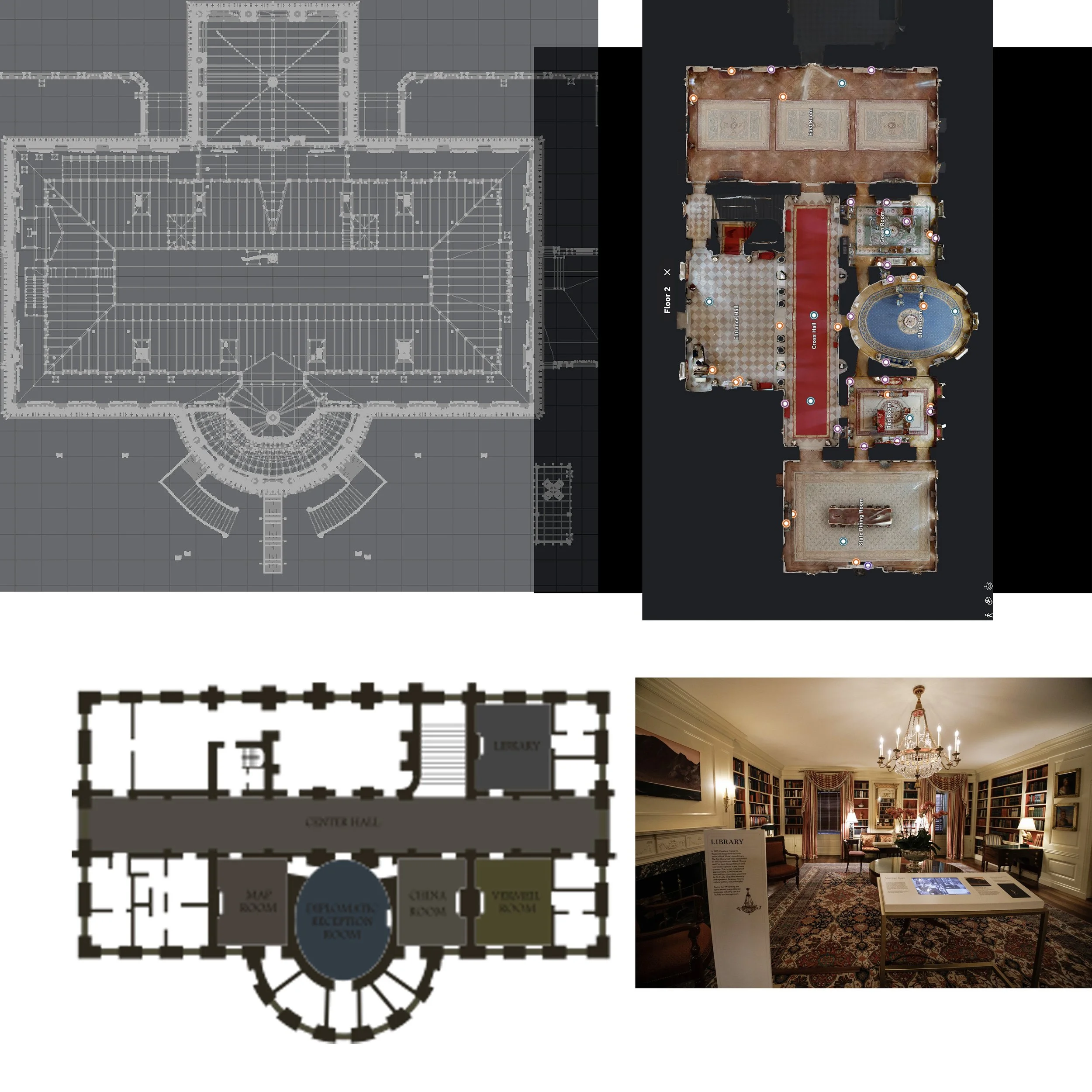 To start, I did some research, found floor plans, worked with models, was supplied many photos of the interiors (pre-gold-spray-paint interiors, that is), and began modeling: