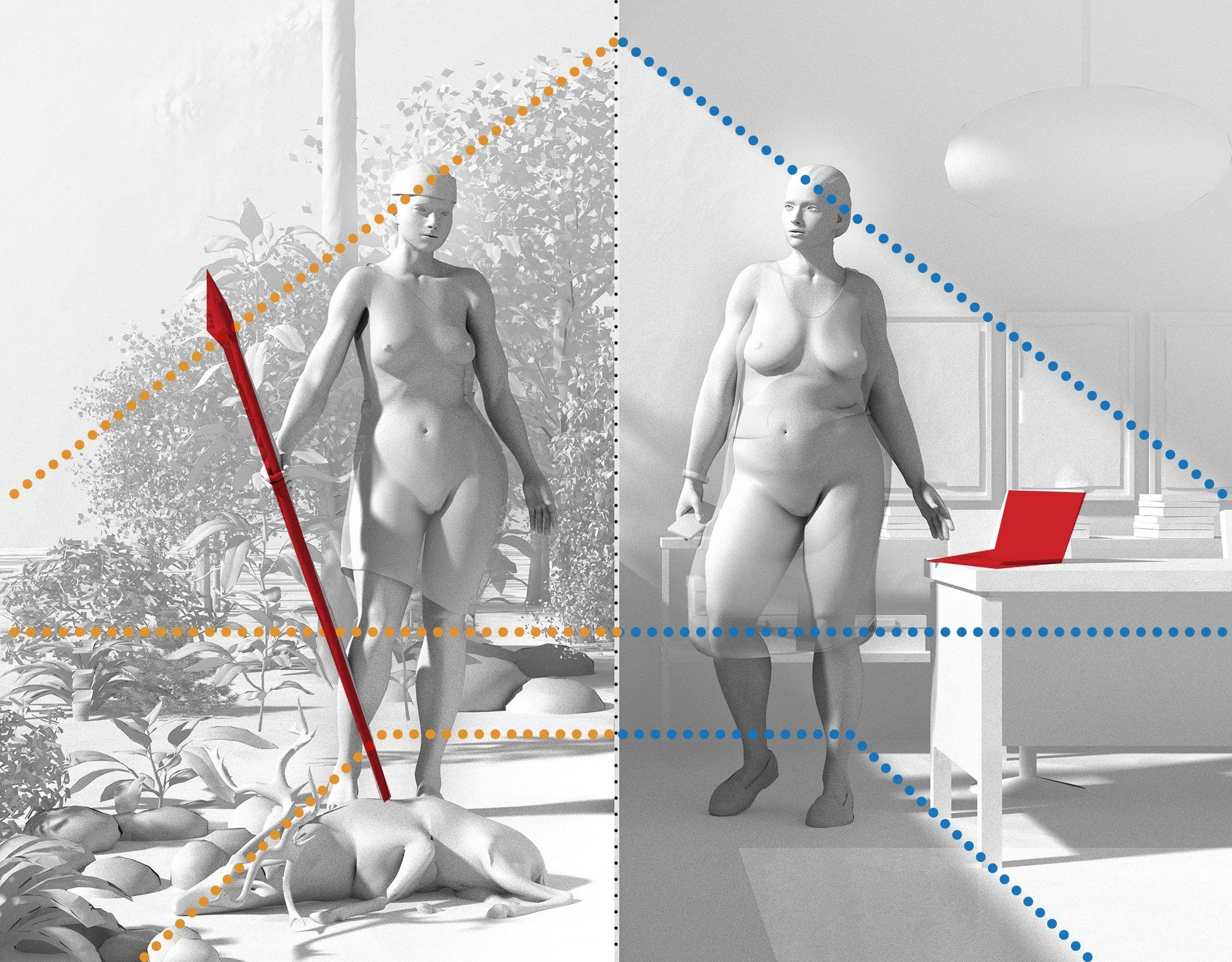 I suggested we show a hypothetical female with PCOS in two different scenarios: one of a hunter-gatherer, and the other in a modern-day work environment. Same woman, same caloric intake, just different weight distributions because of the energy requirement being so different between the two worlds. Here’s the final illustration I sent: