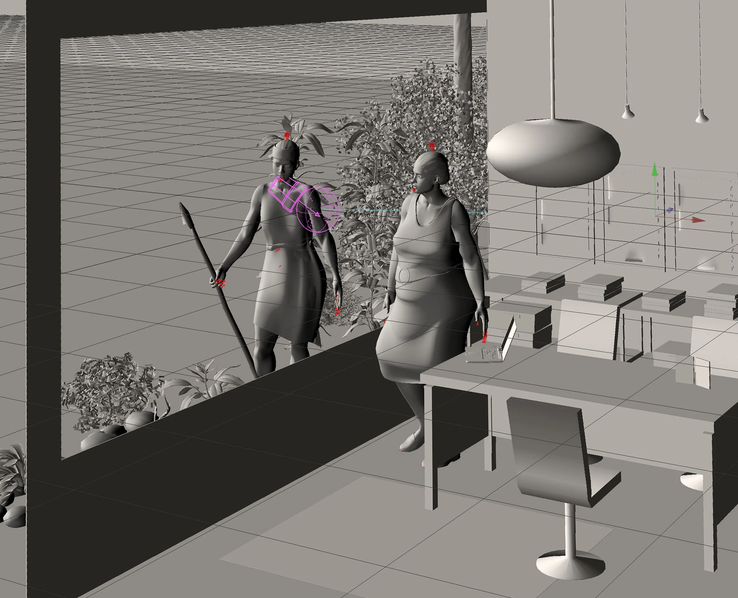 The camera position is critical. I’ll show you a view using the same camera but from a lower angle and using a wider-angle lens. The models are exactly the same, they’re in the exact same position, but because of this different vantage point and more extreme focal length, the feeling changes considerably: