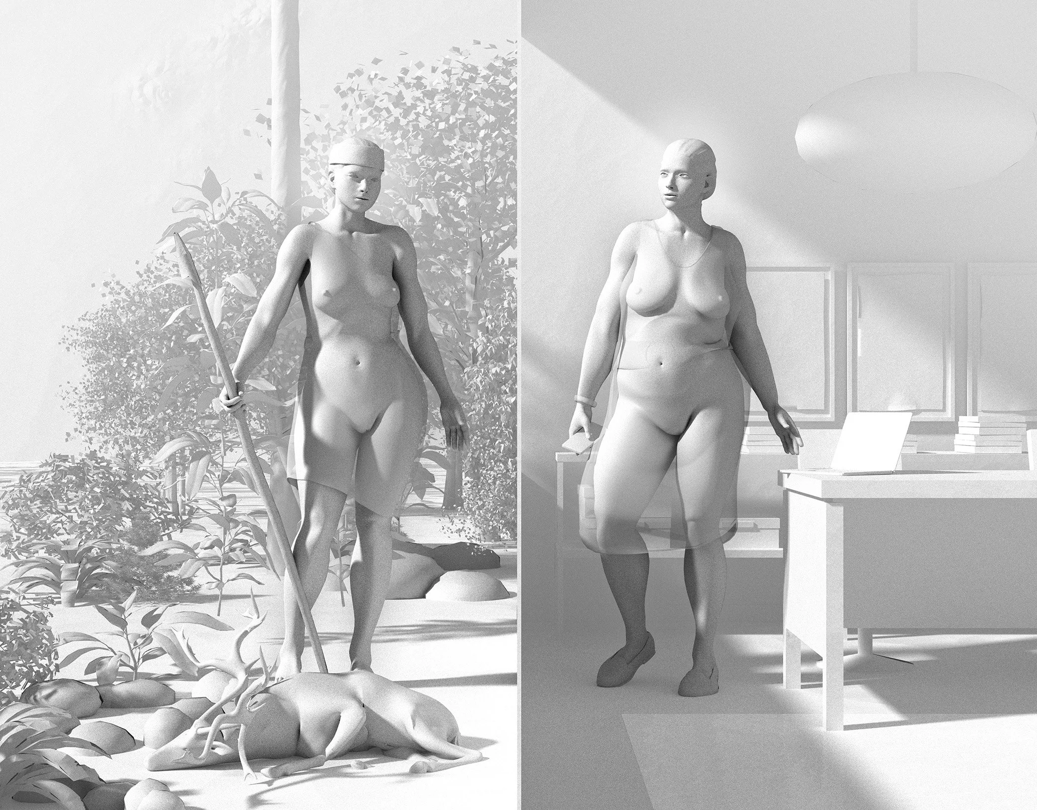 In her right hand, the hunter holds a spear, with which she killed the deer at her feet. This is her tool of survival; she hunts game in order to keep a high enough caloric intake to survive. The woman in the office gestures with her left hand (the “mirror” hand of the hunter’s) to the laptop on a desk: her tool for survival in a modern technological world, where she must earn an income to pay for food, shelter, etc.